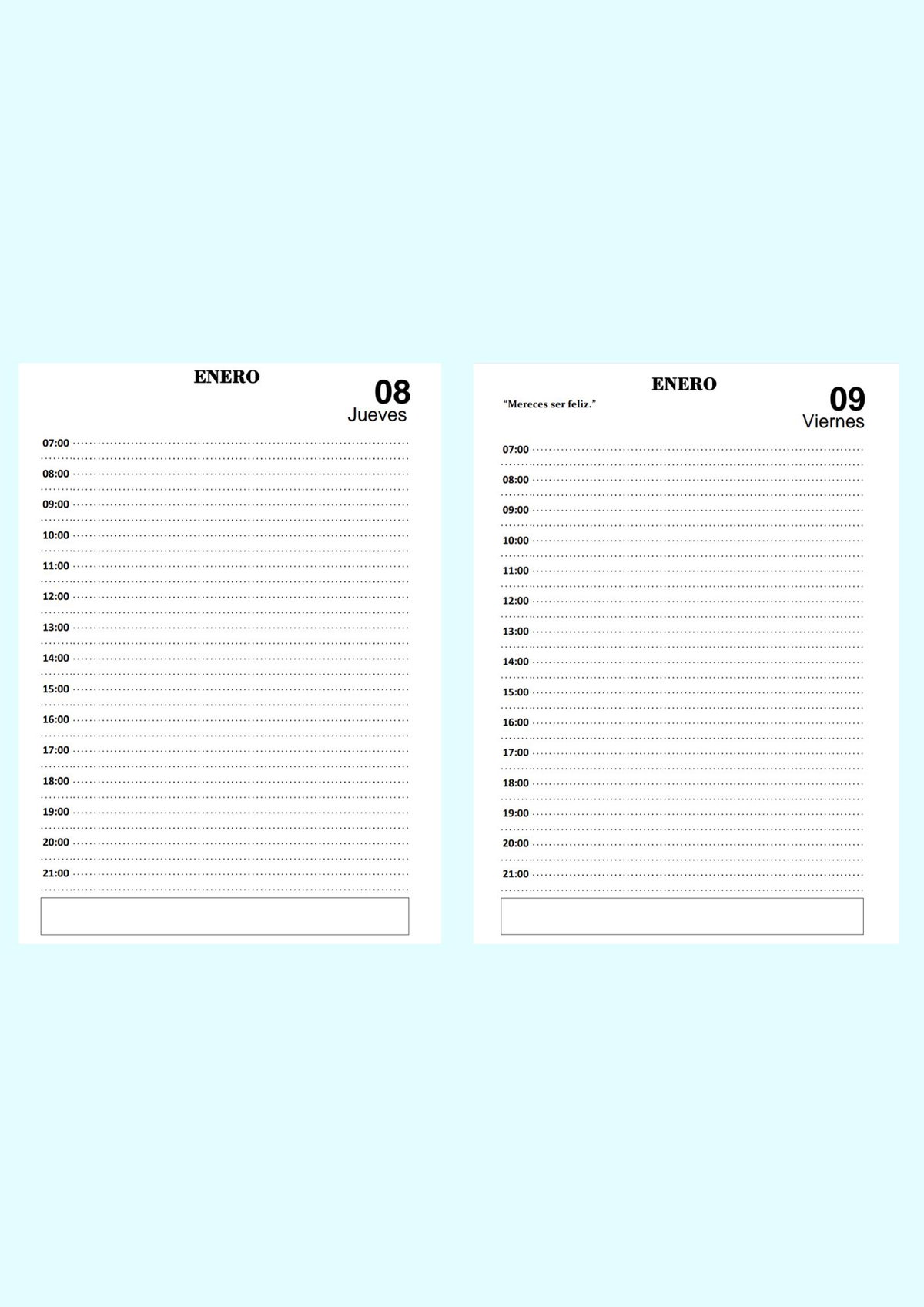 -Diagramación de agenda diaria con hora (un día por carilla con horario de 07hs a 21hs)