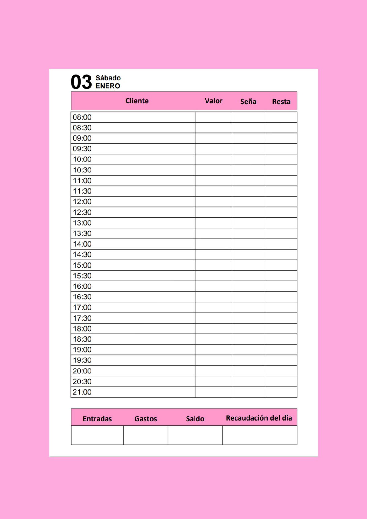 -Diagramación de agenda diaria con hora (un día por carilla con horario de 08hs a 21hs)