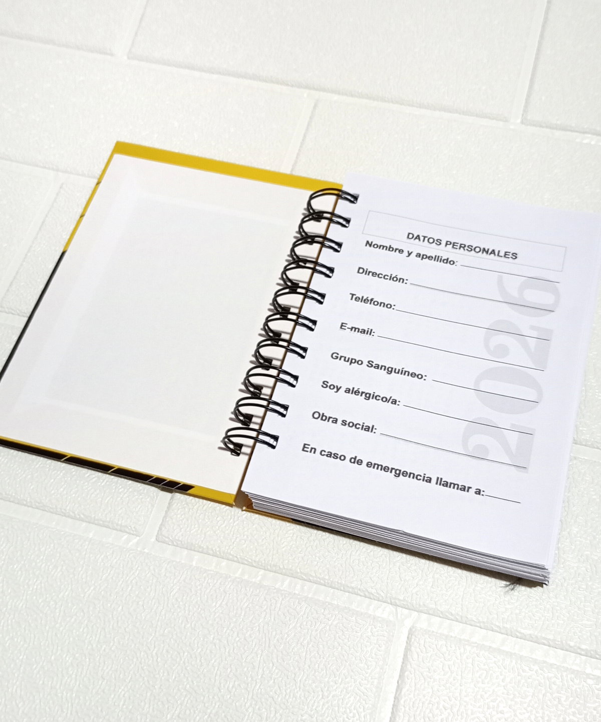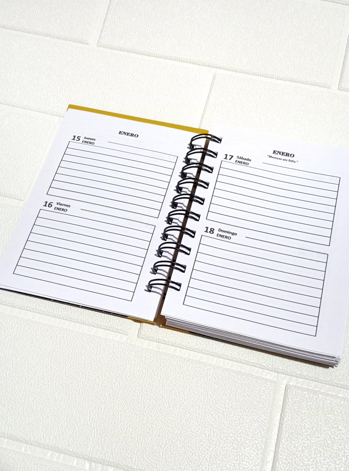 La agenda puede ser con el diseño de tapas predeterminadas (expuesto en la pagina) o personalizadas con tu logo, frase, nombre o imagen que desees.